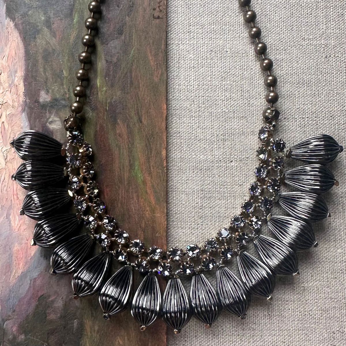 Our Mumbai necklace features a sequence of striped drops and hematite sewn one by one. Enhanced with a delicate crystal embroidery.